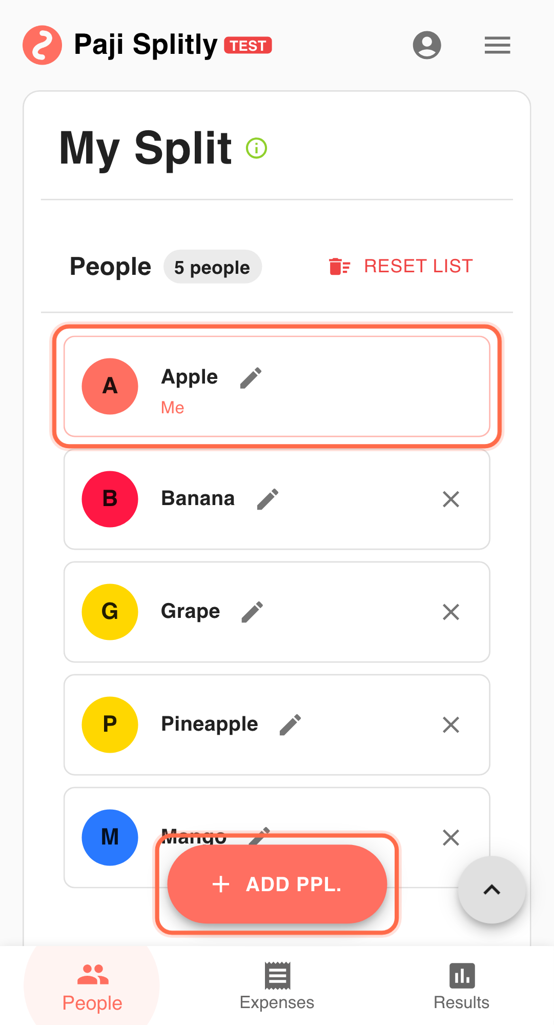 - Risk 1: Two fruit nicknames accidentally refer to the same person (e.g., someone is added as both "Mango" and "Apple"), splitting their share across two phantom participants. Mitigation: do a quick verbal roll call — point to each nickname and have the real person raise their hand.