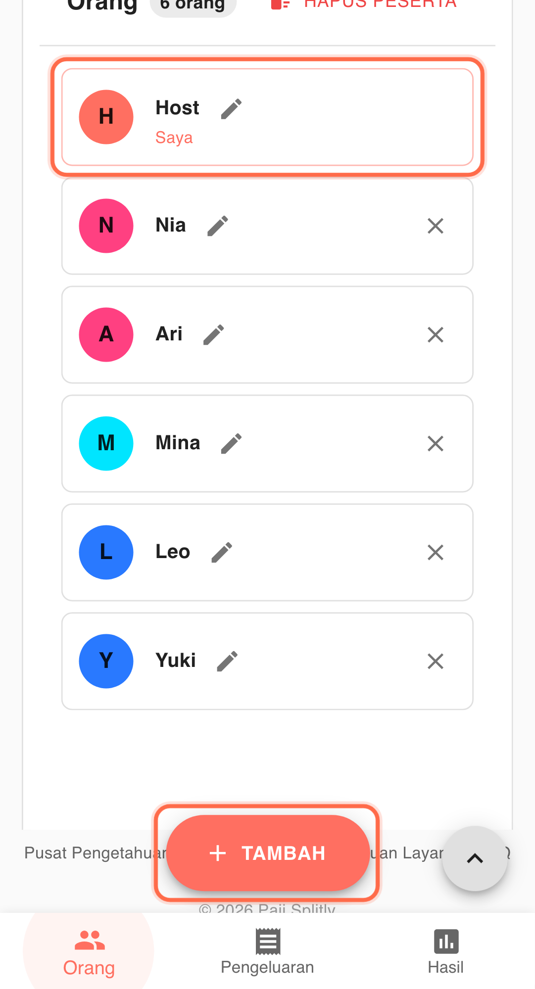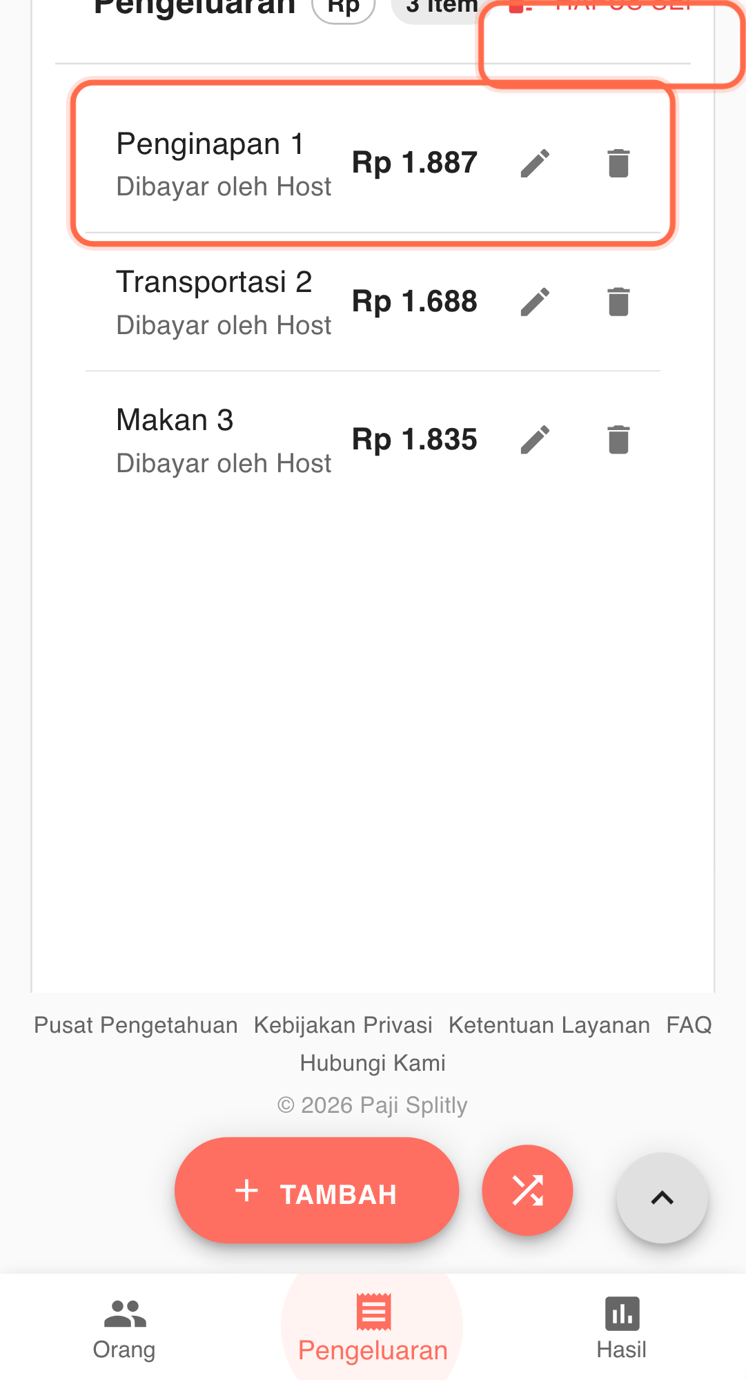 Kasus ini menunjukkan alur praktis di Paji Splitly: rapikan input terakhir, cek "Hasil", lalu selesaikan pembayaran dengan "Lunasi Hutang" selagi semua masih ada.