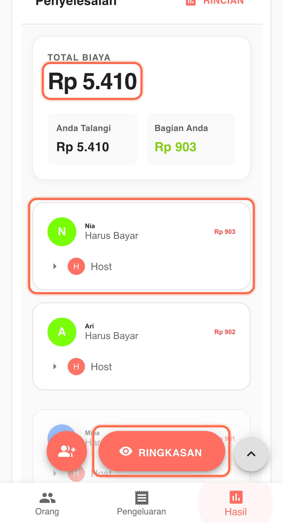 Cek "Hasil" Pastikan siapa bayar ke siapa dan nominalnya benar.