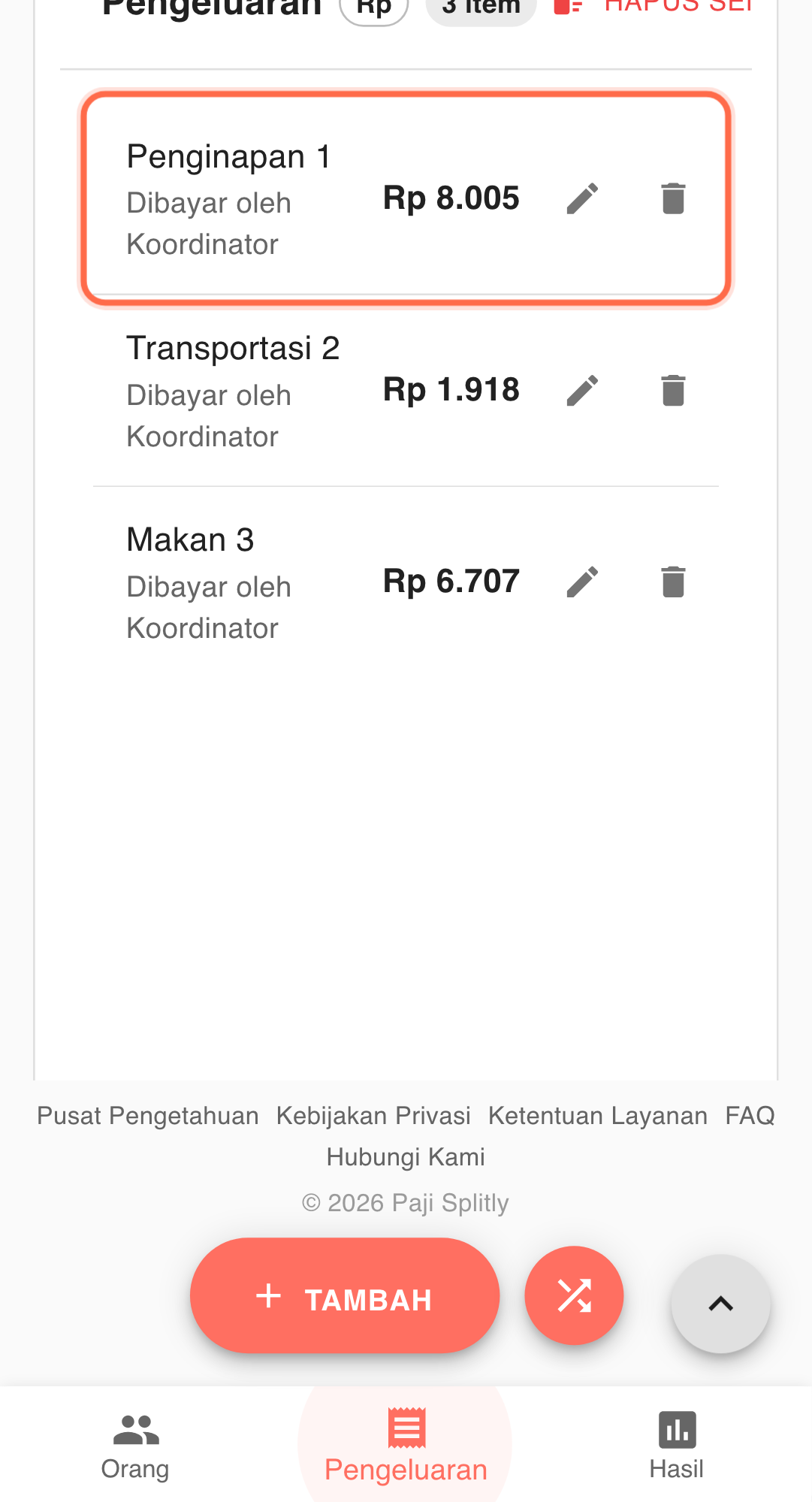 - Periksa apakah perubahan cakupan peserta (misal alat tulis dibagi 3 bukan 5) benar-benar memperbarui saldo tiap orang, bukan sekadar deskripsi item.