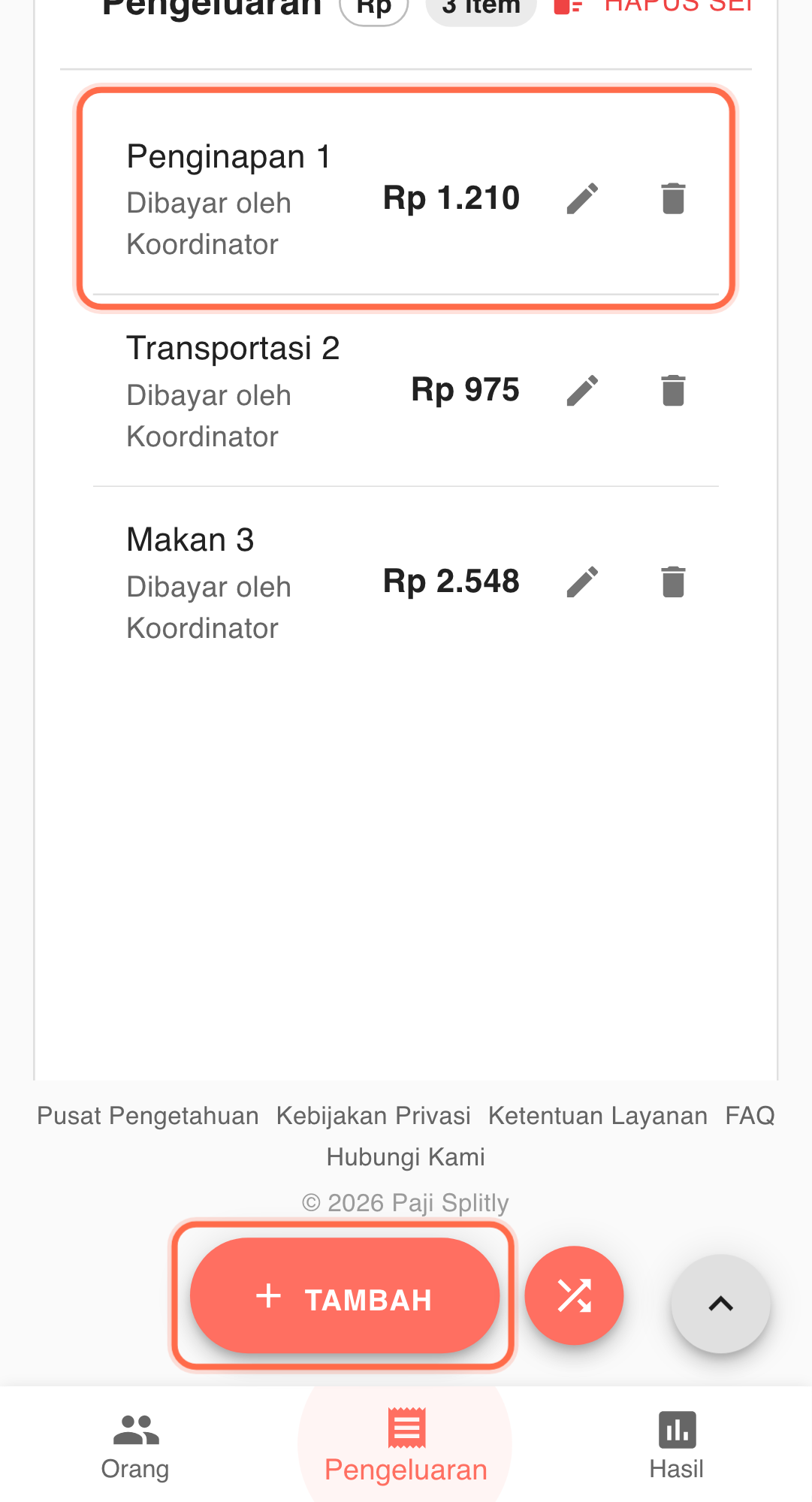 - Buka setiap baris pengeluaran dan pastikan aturan split yang benar terpasang: Bagi Rata untuk hidangan bersama, Persentase untuk minuman, dan Bagian untuk add-on.