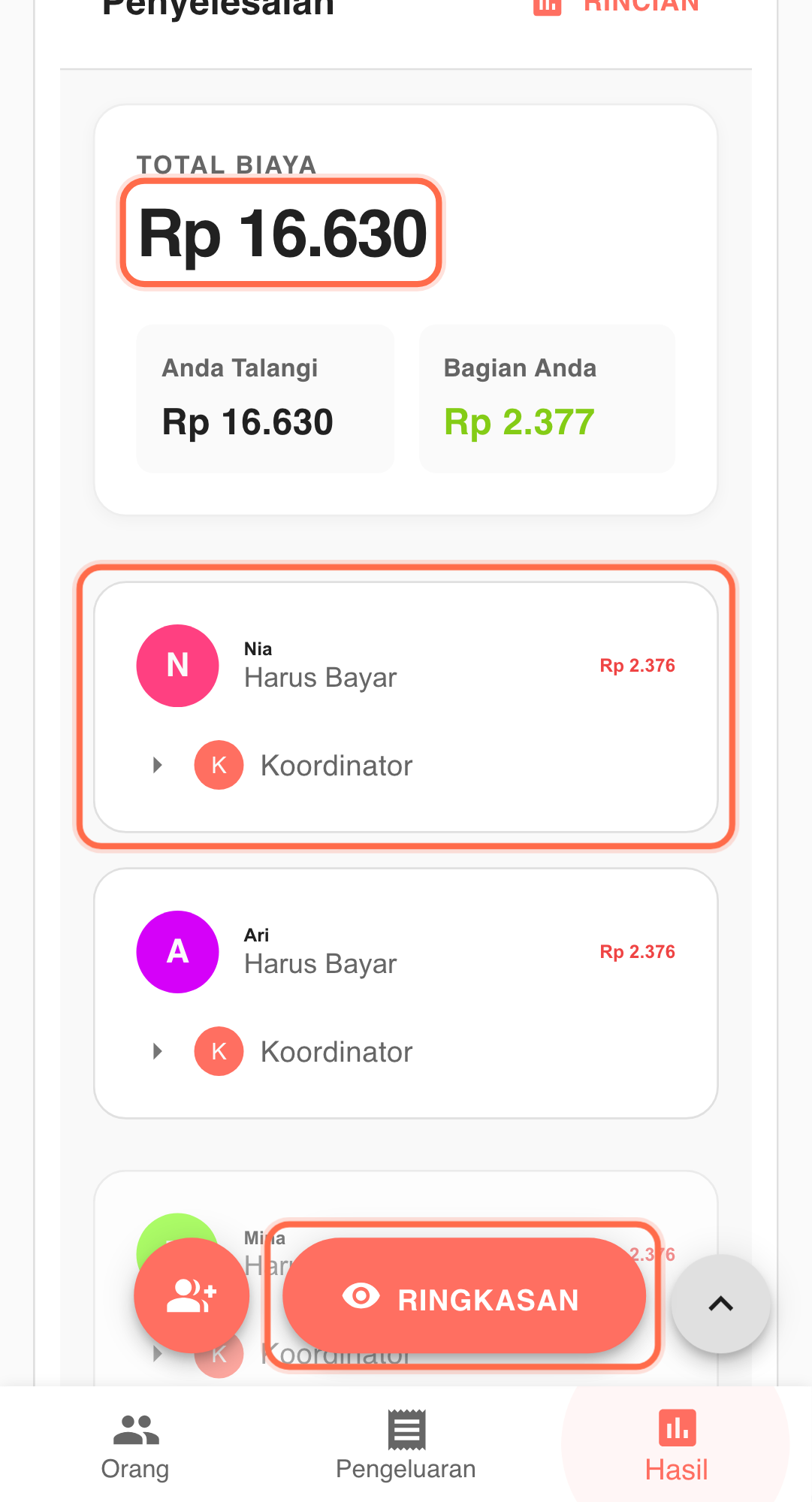 - Cek "Hasil" setelah semua revisi selesai Gunakan hasil akhir untuk melihat siapa bayar ke siapa, lalu lanjut transfer.