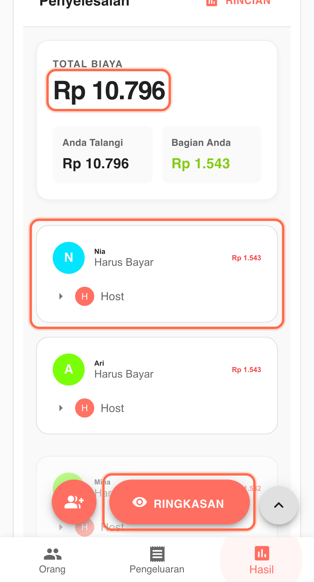 - Setelah melengkapi sisa item lewat Batch Mode, pastikan total di Hasil cocok dengan struk asli sebelum dibagikan.