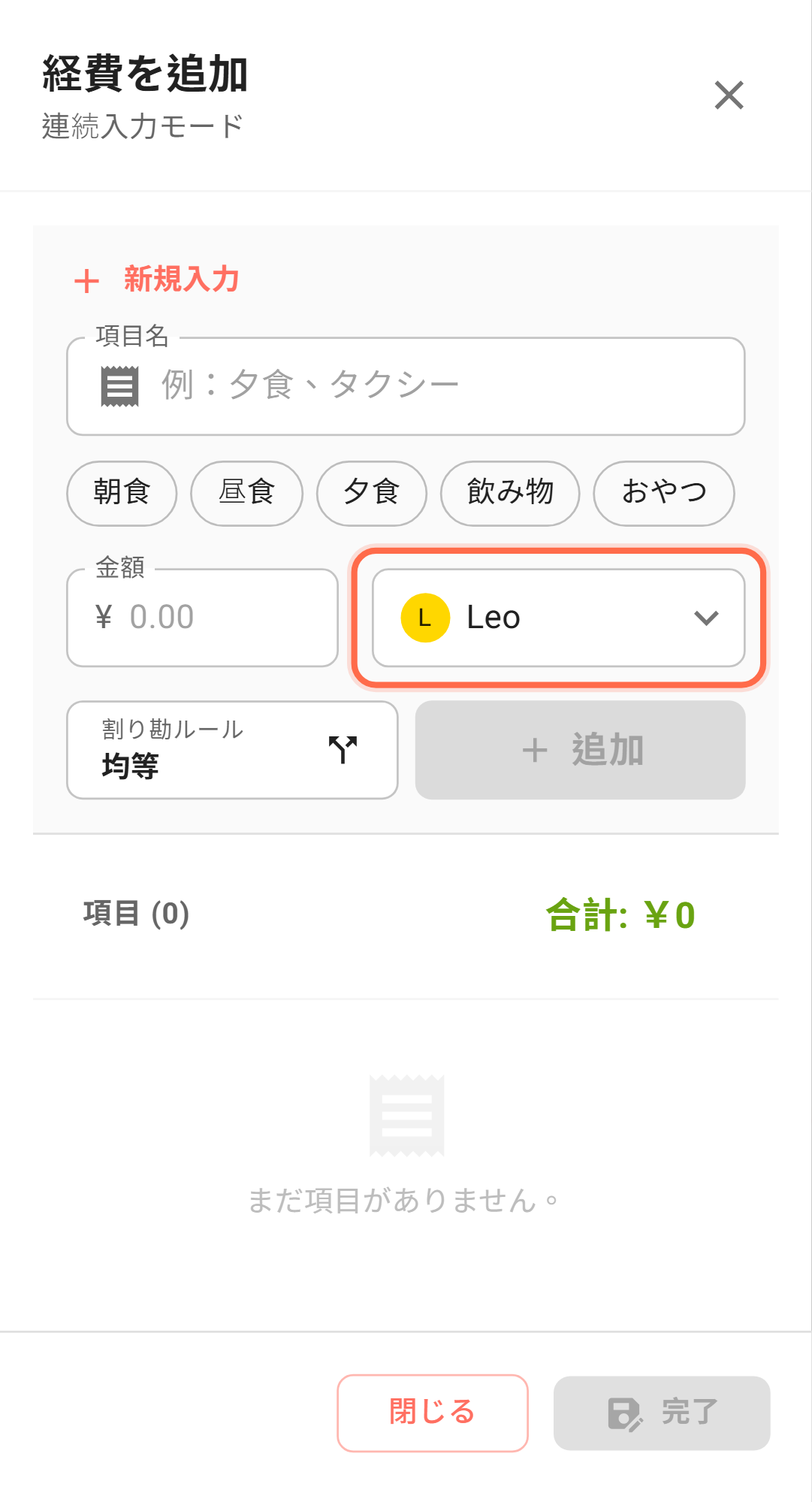- 参加者の範囲が正しいか。全員に奢るなら全員選択、自分の分だけなら自分のみ。