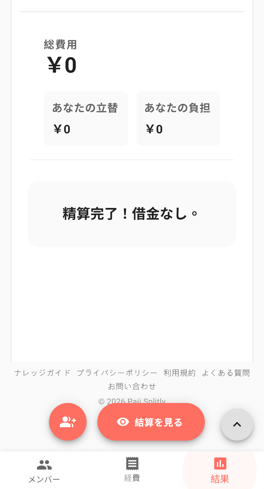 精算結果で確認 送信後、精算結果ページが即時更新される。この支出が奢り(支払い者=当選者、参加者=全員)であれば、他のメンバーはこの項目の負担がゼロになる。