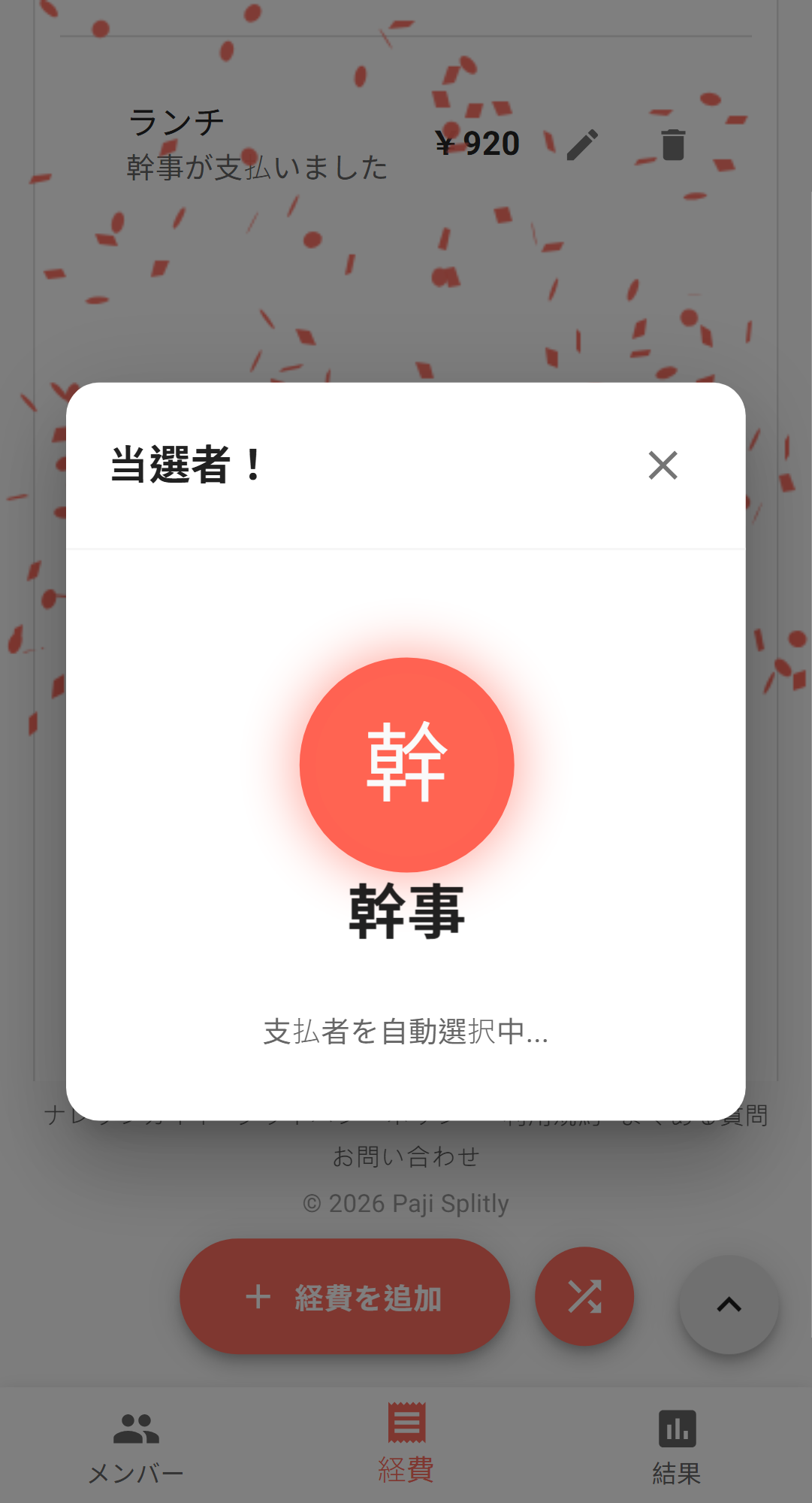 くじを引いて結果を見る システムがランダムに1名(または複数名)を選出。アニメーション後、当選者が画面に表示される。 「誰が奢るか」なら1人引けば十分。高額なら2〜3人を引いて分担もできる。