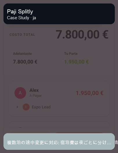 このケースでは、Paji Splitly で宿泊費を夜ごとに分け、費目ごとに参加者を設定する運用を紹介します。