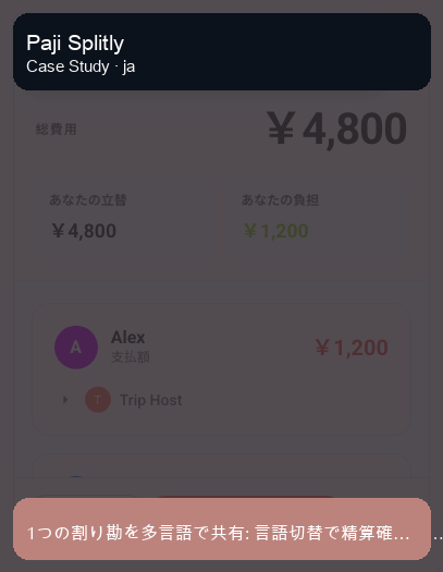 このケースでは、Paji Splitly で同一データを維持したまま各自が言語を切り替え、「結果」と「精算書」で認識をそろえる流れを紹介します。