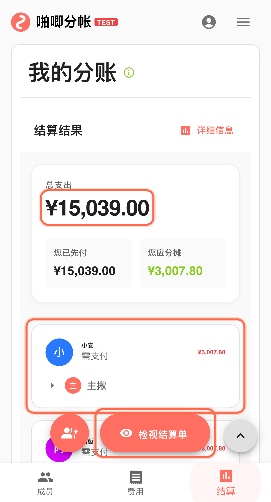 - 用连续记账补完零散项目后,在「结算结果」里核对总额和原始收据是否一致,确认后再分享。