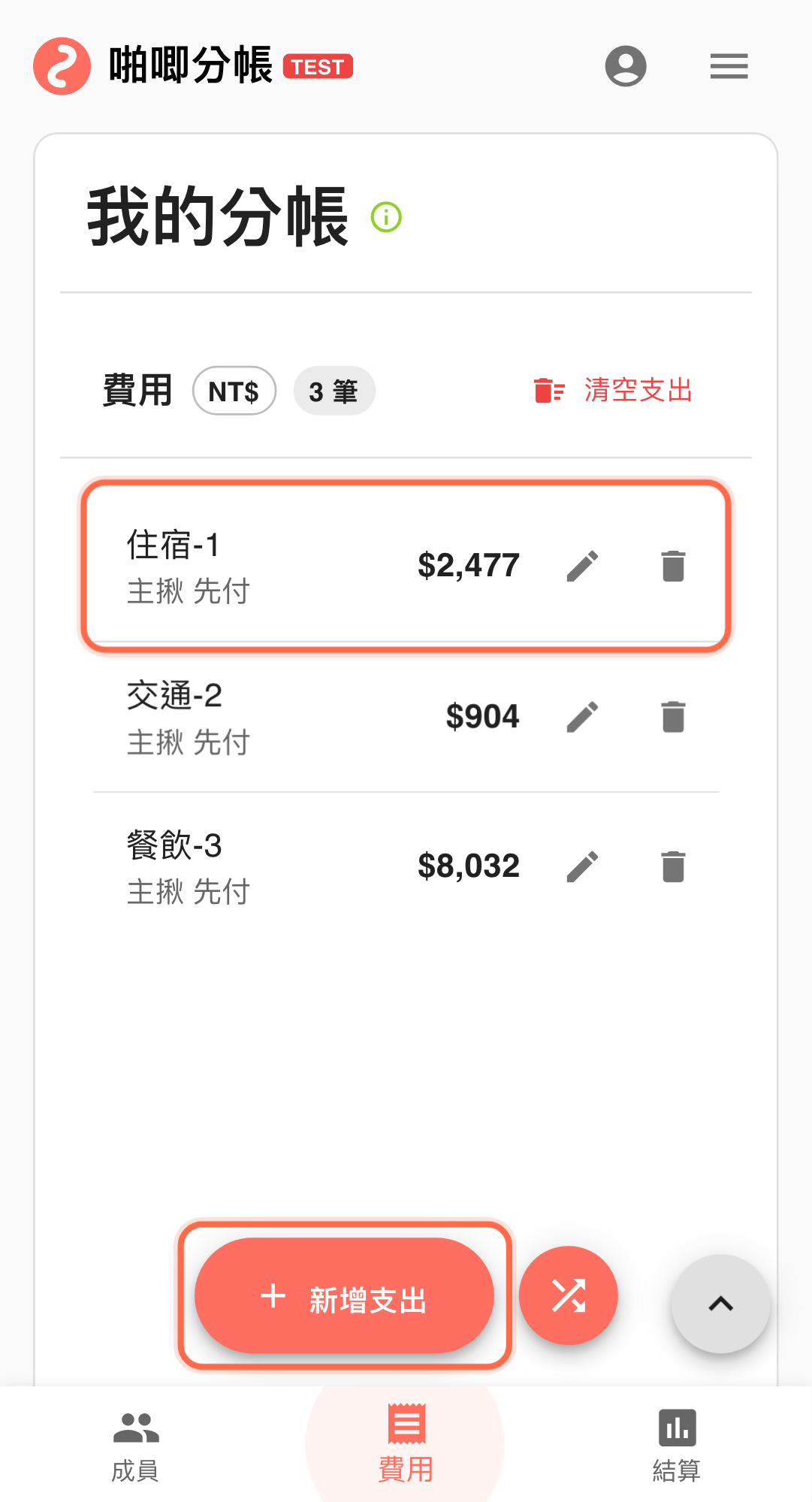- 依序輸入項目、金額、付款人,逐筆按「加入」。