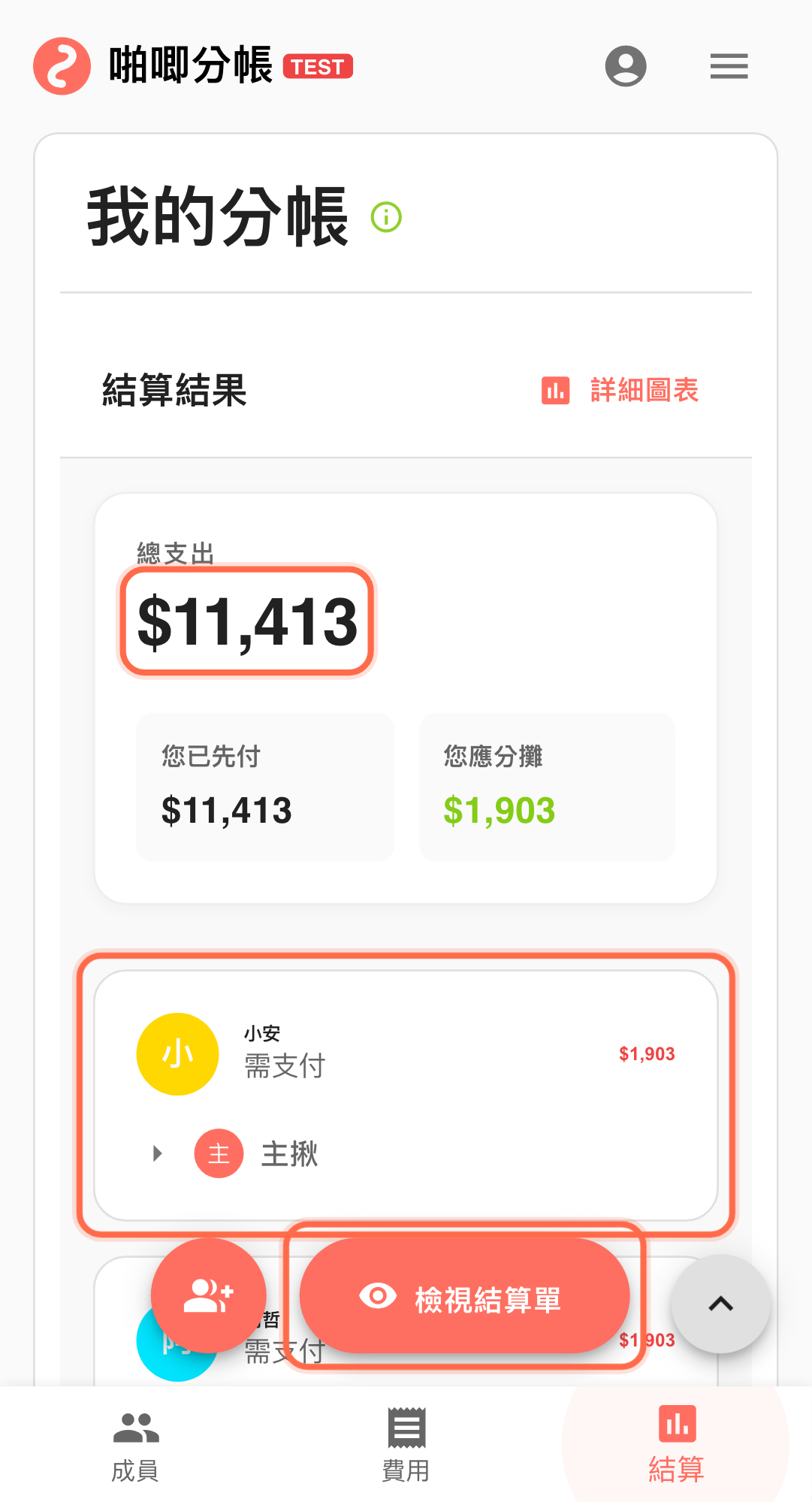 - 連續記帳補完剩餘項目後,回到「結算結果」確認總額與原始收據一致,再分享給成員。