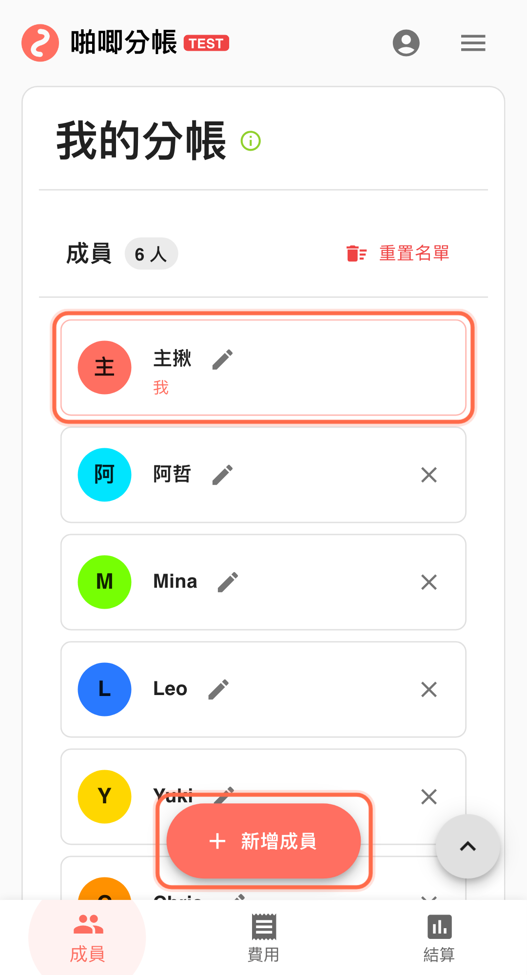 - 檢查被編輯過的費用,確認每人分攤金額有正確重新計算(例如原本 5 人分攤變成 6 人分攤)。