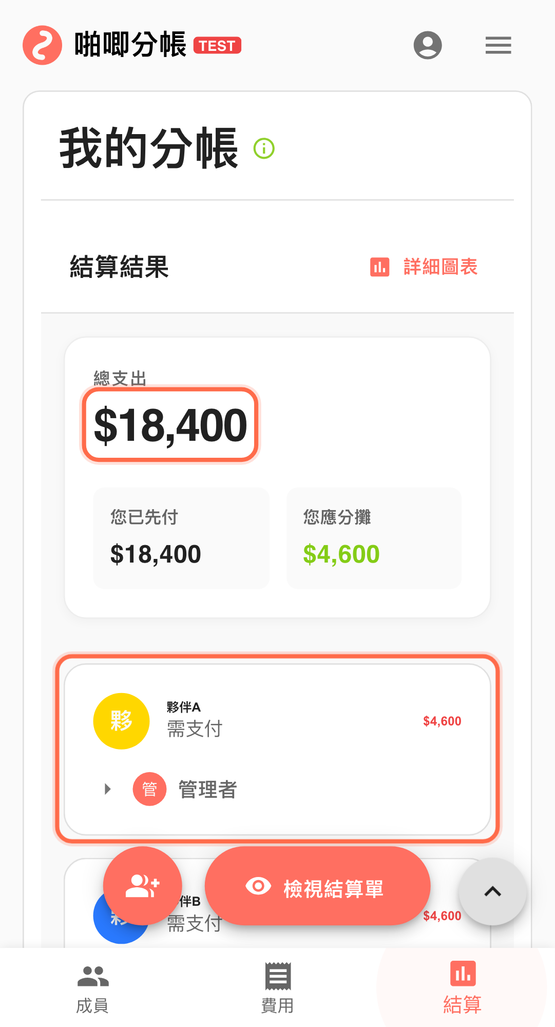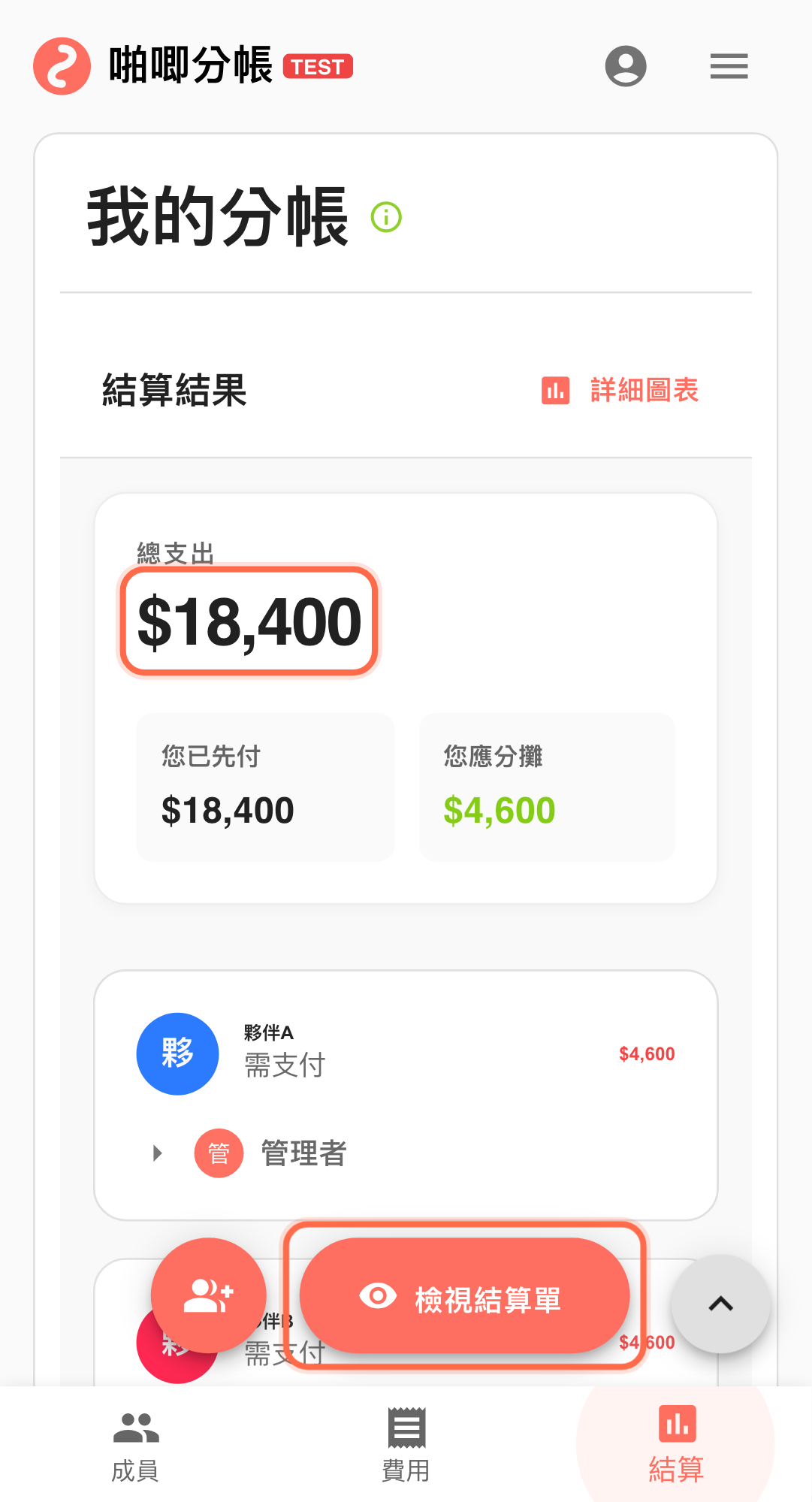 這次示範週報帳單是 4 位成員、3 筆主要費用,總額 $18,400,畫面可直接對照本週待付重點(例如夥伴A需支付 $4,600)。