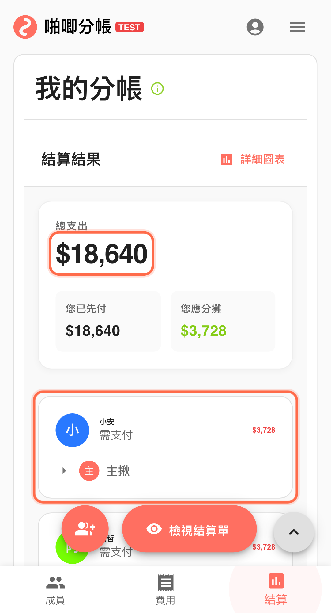 以這個示範帳單來看:你先付總額 $18,640、目前畫面顯示小安需支付 $3,728。先用這種「當期可執行」數字回顧,比先談長期彙總更容易落地。