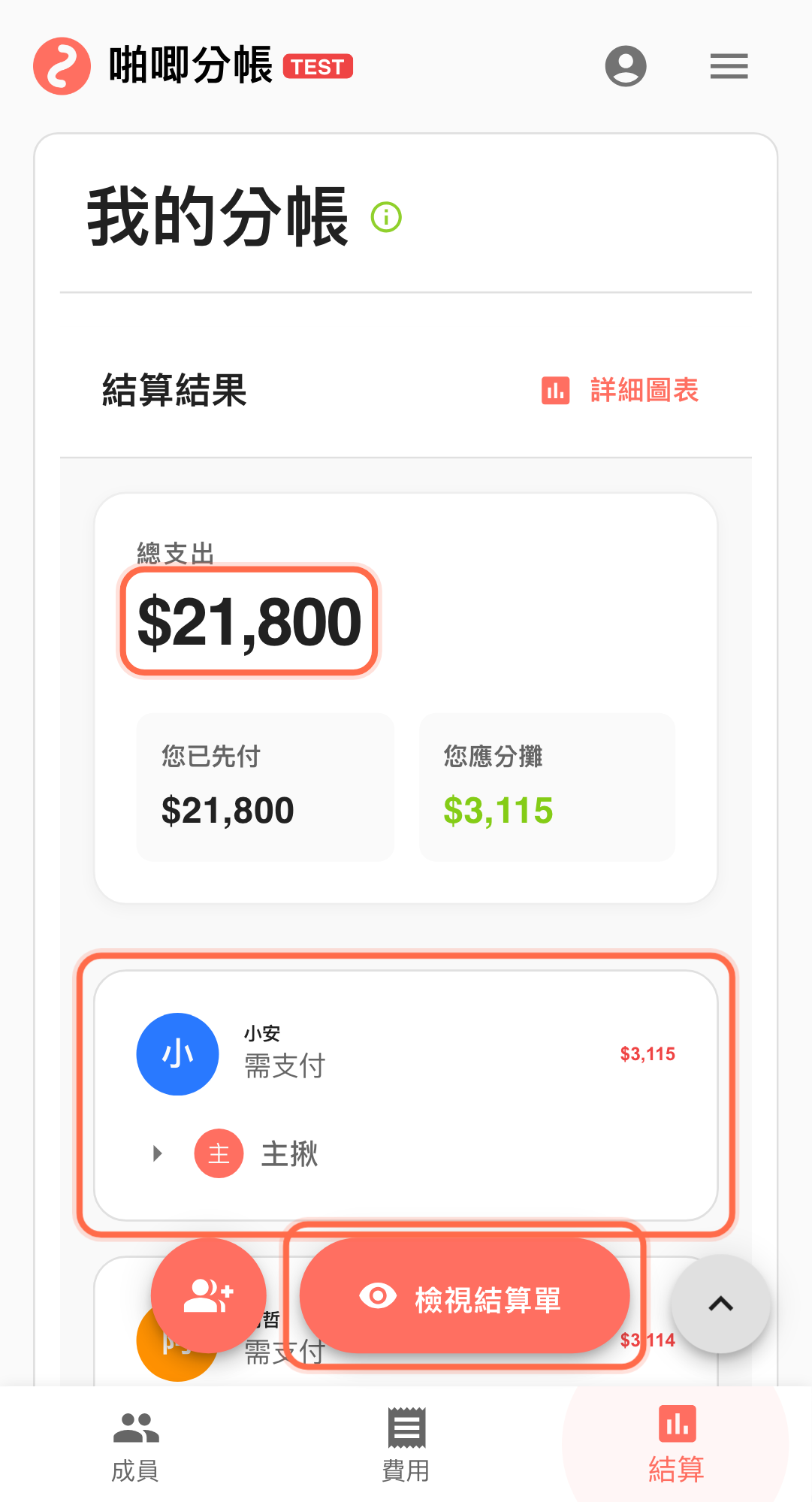 這篇使用情境示範一個更穩的做法:先在啪唧分帳把費用記完,確認「結算結果」後再用「檢視結算單」分享同一份結果,讓每個人都看同一版金額。